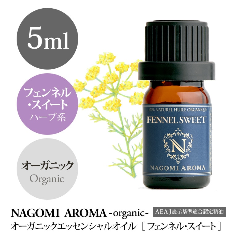 甘くスパイシーな清涼感のある香りで、気分転換したい時にピッタリです。 ※時期やロット、またモニターの環境により色味が異なる場合がございます。 バランス About 背丈は1mほどの多年草。夏には黄色い花を咲かせ、その後楕円形の米粒くらいの果実(種子)をつけます。その果実(種子)はハーブティ―に、インド料理ではカレーのスパイスとして使われています。精油はその果実(種子)をすりつぶして抽出されます。歴史上もっとも古い作物の1つと言われているフェンネルは、古代ギリシャ、ローマ時代に栽培されていた記録があり古くから人々の生活に深く結びついていた植物です。日本でも「ウイキョウ」と呼ばれ昔から使用されていました。 フランスのペルノというお酒の香りづけに含まれる甘くスパイシーな香りなのがフェンネルです。サンダルウッドなど甘く濃厚な香りをすっきりとさせたい時に、少しフェンネルをブレンドすると使いやすくなります。 Details オーガニックとは、化学的に合成された肥料及び農薬を使用せずに、土壌の性質に由来する農地の生産力を発揮させ自然と融合する [ 有機農法 ]で生産された農作物のことです。 日本の有機認証制度は食品にしか対応していないため、日本での規格にはありませんが、オーストラリアの認証機関【ACO】の規格により認証された商品を輸入し、国内でパッキングしてお届けしています。 | 学名 | Foeniculum vulgare dulce | | ノート | ミドル | | 英名 | Fennnel_sweet | 粘性 | 低い | | 科名 | セリ科 | 香りの系統 | ハーブ系 | | 産地 | エジプト ※時期やロットよって変更する場合がございます。 | 香りの特徴 | ほんのりフローラルでスパイシーな香り | | 抽出部位 | 種子 | 香りの強さ | 中程度 | | 精油製造方法 | 水蒸気蒸留法 | キーワード | バランス | | ご注意事項 | | Other ItemsSize Variationサイズバリエーション Other VariationNAGOMI PURE シリーズはこちら