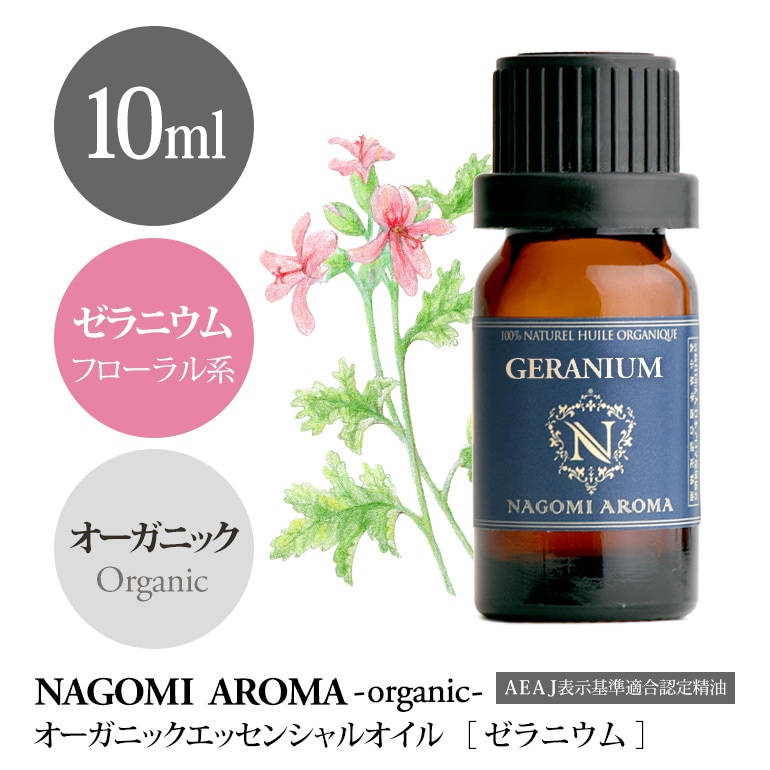 グリーンがかったローズにとてもよく似た甘さの中にミントを少し加えたような上品ですがすがしいハーバルな香りです。その甘く、少し優雅な香りは女性に人気です。 ※時期やロット、またモニターの環境により色味が異なる場合がございます。 バランス About アロマテラピーで「ゼラニウム」と呼ばれるものはニオイテンジクアオイの仲間センテッド(芳香性)ゼラニウムのひとつ「ローズゼラニウム」です。高さ約60cm程度まで生育する低木で、切りこみのある葉をつけピンク色の美しい花を咲かせます。大量のゼラニウムの葉から水蒸気蒸留でわずかしか抽出されない貴重なものです。ローズにとてもよく似た香りで、成分もゲラニオールなどローズと共通のものも含まれています。ゼラニウムは古くから様々な用途に使われてきた植物です。ヨーロッパで窓辺に赤いゼラニウムの花を飾る習慣があるのは災厄より家を守るためとも言われています。 ローズに似た香りは甘くてちょっと苦手…という方はオレンジ・スイートなど柑橘系のエッセンシャルオイルとブレンドしてお使い頂くことをおすすめします。香りがとっても爽やかなので、窓の近くで芳香浴をすれば、お部屋の中に爽やかな香りが広がります。特に虫が気になる季節におすすめです。 Details オーガニックとは、化学的に合成された肥料及び農薬を使用せずに、土壌の性質に由来する農地の生産力を発揮させ自然と融合する [ 有機農法 ]で生産された農作物のことです。 日本の有機認証制度は食品にしか対応していないため、日本での規格にはありませんが、オーストラリアの認証機関【ACO】の規格により認証された商品を輸入し、国内でパッキングしてお届けしています。 | 学名 | Pelargonium graveolens | | ノート | ミドル | | 英名 | Geranium | 粘性 | 低い | | 科名 | フウロソウ科 | 香りの系統 | フローラル系 | | 産地 | エジプト ※時期やロットよって変更する場合がございます。 | 香りの特徴 | ローズに似た甘さの中にミントを思わせるハーバルな香り | | 抽出部位 | 葉 | 香りの強さ | 中〜強い | | 精油製造方法 | 水蒸気蒸留法 | キーワード | バランス | | ご注意事項 | | Other ItemsSize Variationサイズバリエーション Other VariationNAGOMI PURE シリーズはこちら