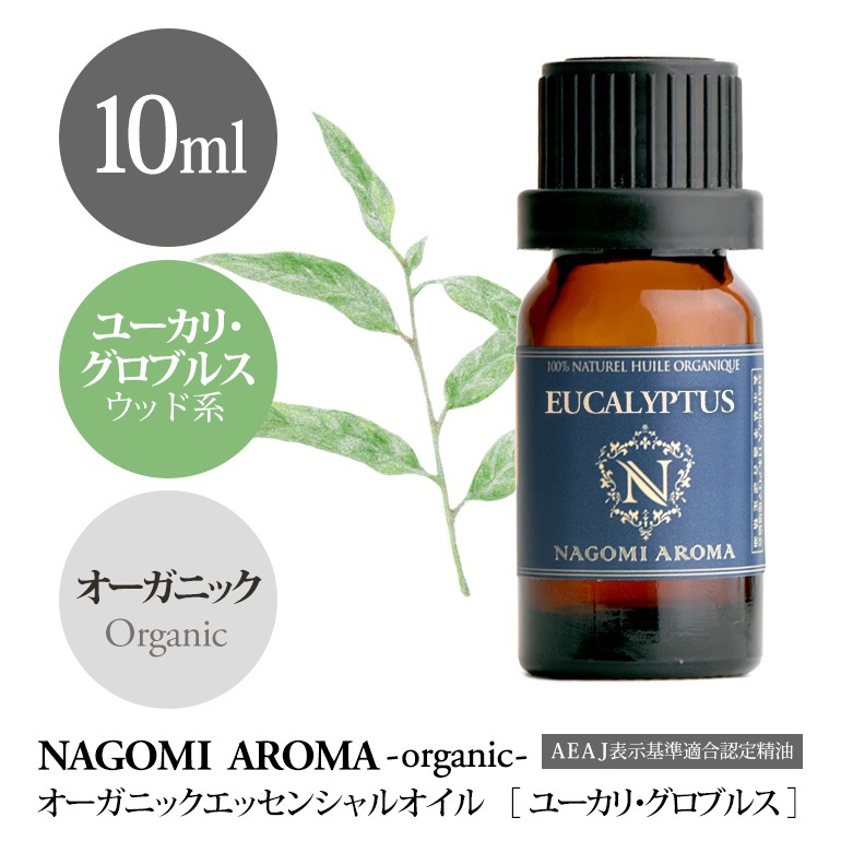 ウッディな香りが強いので親しみがあり、森林の中にいる様な心地いい香りがします。シャープで透き通るようなクリアな香りは、グリーンをイメージさせてくれます。 ※時期やロット、またモニターの環境により色味が異なる場合がございます。 リフレッシュ About ユーカリは樹高50mほどのフトモモ科の常緑高木で、とても生命力が強く、乾燥地でもよく育ちます。Eucalyputusという学名は、ギリシア語で「よく覆った」を意味し、旺盛に繁殖する様子を表します。ティートゥリーと同様に、優れた特性を持つ植物としてオーストラリアのアボリジニ(原住民族)に大切に利用されてきました。コアラの食べ物としても有名です。ユーカリの種類は約600種。アロマテラピーで用いられるのはそのうち15種類しかありません。一般にユーカリというと、ユーカリ・グロブルスのことを言います。 ユーカリにはたくさん種類がありますが、最も一般的なユーカリがグロブルスです。掃除機のフィルターに数滴たらしておくと、お掃除をする時にさわやかな香りがするので気持ちよくお掃除ができます。冬場、春先の乾燥する時期には、リビングなどでの芳香浴がおすすめです。 Details オーガニックとは、化学的に合成された肥料及び農薬を使用せずに、土壌の性質に由来する農地の生産力を発揮させ自然と融合する [ 有機農法 ]で生産された農作物のことです。 日本の有機認証制度は食品にしか対応していないため、日本での規格にはありませんが、オーストラリアの認証機関【ACO】の規格により認証された商品を輸入し、国内でパッキングしてお届けしています。 | 学名 | Eucalyptus globulus | | ノート | トップ | | 英名 | Eucalyptus | 粘性 | 低い | | 科名 | フトモモ科 | 香りの系統 | ウッド系 | | 産地 | インド ※時期やロットよって変更する場合がございます。 | 香りの特徴 | シネオール特有のスーッとしたシャープな香り | | 抽出部位 | 葉、枝 | 香りの強さ | 強い | | 精油製造方法 | 水蒸気蒸留法 | キーワード | リフレッシュ | | ご注意事項 | | Other ItemsSize Variationサイズバリエーション Other VariationNAGOMI PURE シリーズはこちら