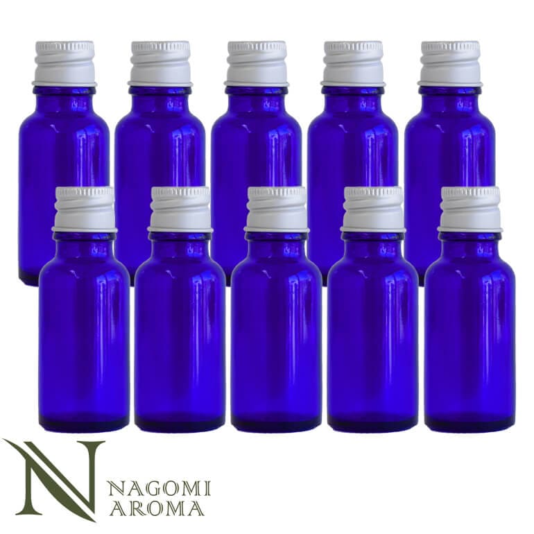 遮光瓶(ブルー)にドロッパーとシルバーキャップがついています。オイルの小分けや、ブレンド用に便利な遮光ビン・スタンダードなタイプのドロッパーとシルバのーキャップのセットです。ガラス瓶の色は青色(ブルー)で、海の底のような透明感がブルーボトルの魅力。ヨーロピアンな印象を演出できます。